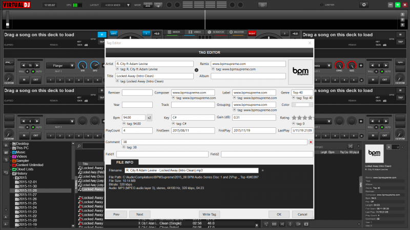 2) tracklist.txt - The earlier post shows all files played from 11/20. This song (and many others) were not there. Also, I will listen to my set, and find a few more songs that were played. I will also check their "Tag Editor", just to really confirm.
