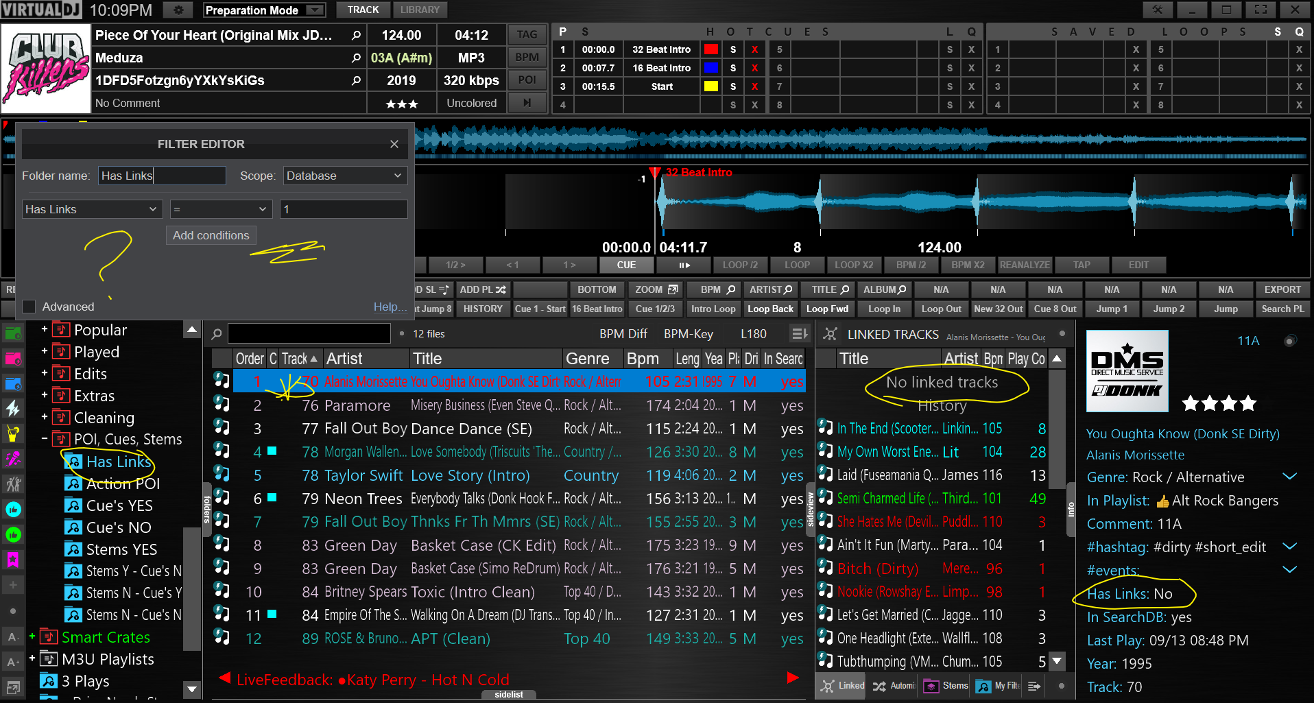 So I am looking to link up some tracks and before I started I setup a smart folder to just make sure I didn't have any linked track. It showed I had about 50 which I assume I did with accidental dragging & dropping because I didn't link any tracks on purpose. I was able to figure out most of them and did unlink them. But I still had 15 tracks that are saying they have links but I can not unlink them. I have a picture attached:
