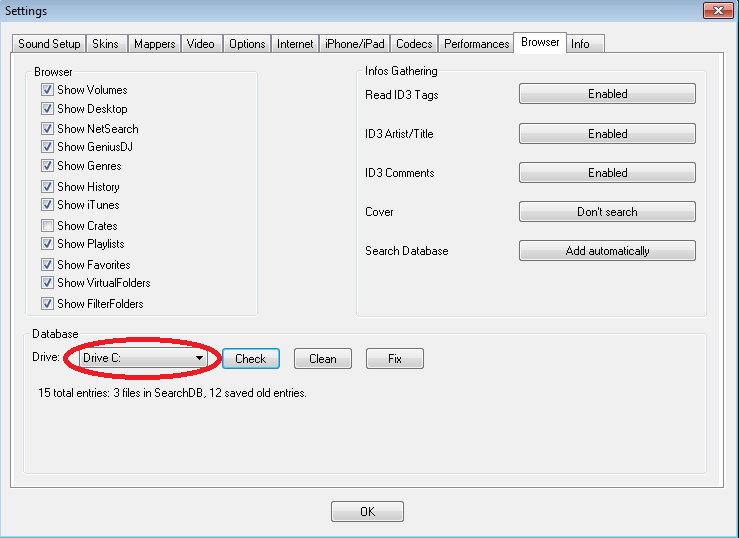 You select your drive (circled in red) then hit check. This is in my back up machine, so you can see at the bottom that out of 15 total entries, I only have 3 that were found this time. 12 are "Old Entries" AKA the songs are not there anymore because I have moved or deleted them.