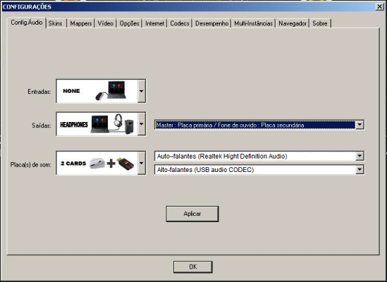 O caminho é esse, basta definir o driver da placa de som do note Realtek Hight Definition Audio como primário (primeiro menu drop-down) e o driver USB audio CODEC da UCA como secundário (segundo menu drop-down). DESDE QUE as duas placas estejam funcionando corretamente.