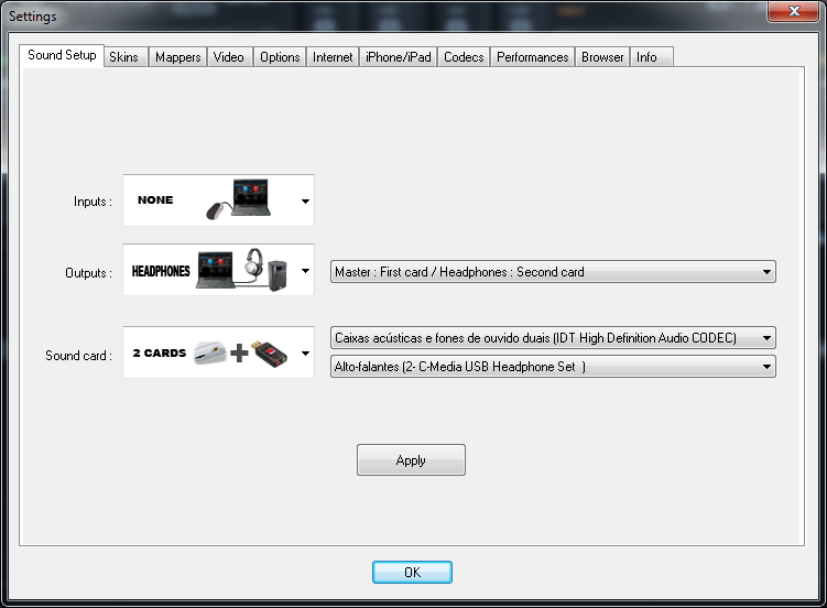 O sound setup errado é o motivo dos maiores problemas com pré. E a inversão de canais master e headphones na hora de conectar é o segundo maior motivo. Por isso eu perguntei sobre o sound setup, que você informou que estava certo, então nem insisti. Eu geralmente não recomendo usar as opções “driver de som primário” ou “driver de som secundário” ao fazer o sound setup, pois em muitos casos isso causa mal funcionamento. Ao invés destas opções, defina exatamente os drivers das suas duas placas de som. Onde estiver “driver primário” escolha o driver da sua placa on-board, e onde estiver “driver secundário” escolha o driver da sua placa USB. Talvez este simples gesto resolva seu problema. Eis um exemplo - uso aqui em casa de vez em quando - a placa master é a IDT e a headphones é a C-media.