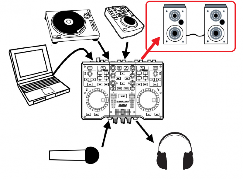 A saída do Hercules MK4 deve ser ligada diretamente ao sistema de amplificação. Veja a figura constante do manual do equipamento, e preste atenção na seta vermelha: