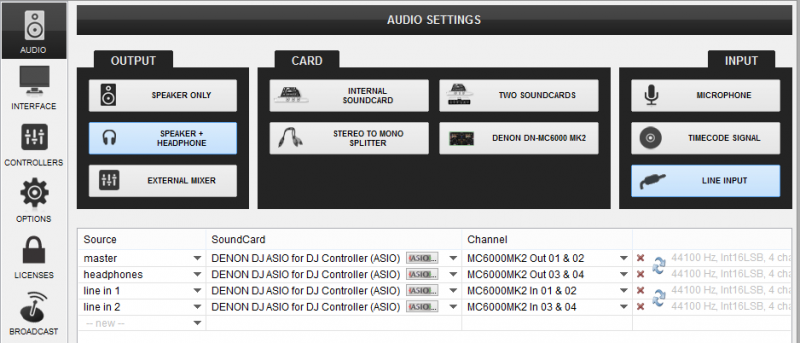 If you have controller revision 906 or greater and the line inputs are not present on your audio setup, please press the "Denon DN-MC6000 MK2" button in order to reset the current audio setup back to the default settings.