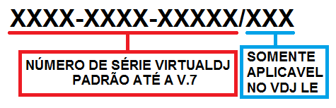 O padrão foi sempre código alfanumérico de 13 dígitos e 3 conjuntos, sendo o primeiro e segundo conjuntos com 4 dígitos, e o terceiro conjunto com 5 dígitos. Para VirtualDJ LE, existe um quarto conjunto de 3 ou quatro dígitos após uma barra, que denomina o modelo do controlador.