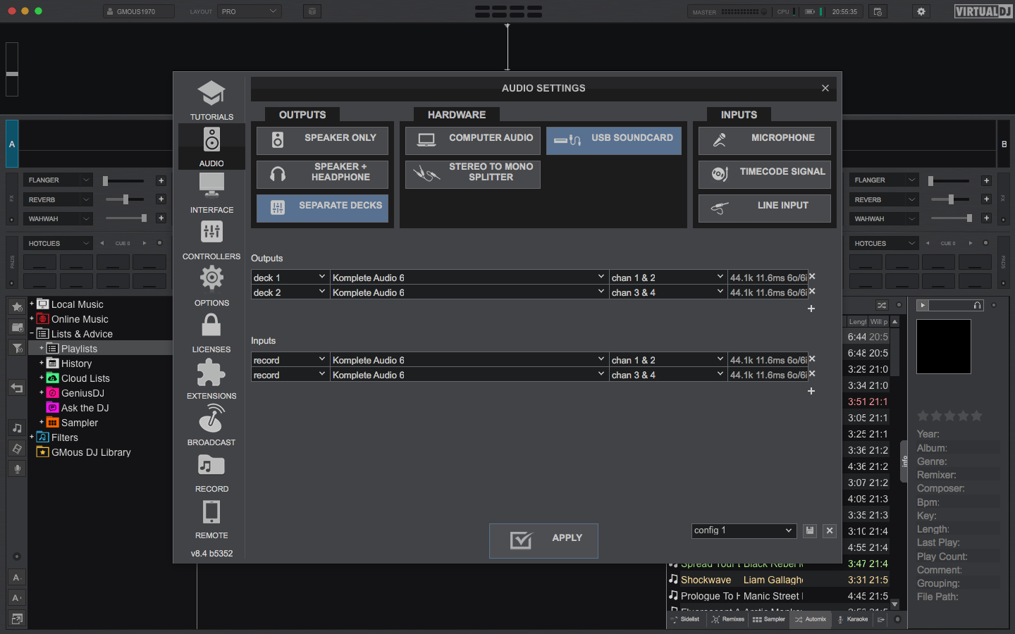 Χρησιμοποιώ το Virtual DJ με εξωτερικό μίκτη (κάρτα ήχου Audio Komplete 6).