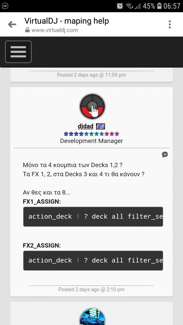 Προσπάθησα σήμερα να βάλω το μαπινγκ που μου έστειλες αλλα κάτι δεν πάει καλά η κάτι κάνω λάθος.... στο deck1 το effe 1 δουλεύει μια χαρά το effe2 όμως δεν δούλευε καθόλου, άλλαξα το cut σε noise και δούλεψε, όμως... Ενώ έβαζα στο deck2 τα effe δούλευαν από του deck1 ... έκανα πολλές προσπάθειες, τα έκανα και χειρότερα να παίζει το ένα και να ανάβουν όλα ... τα διόρθωσα μετά άλλα δεν μπόρεσα να βγάλω τελικά άκρη... μπορείς να μου στείλεις να κάνουν το εξής για να μην μπερδευόμαστε..