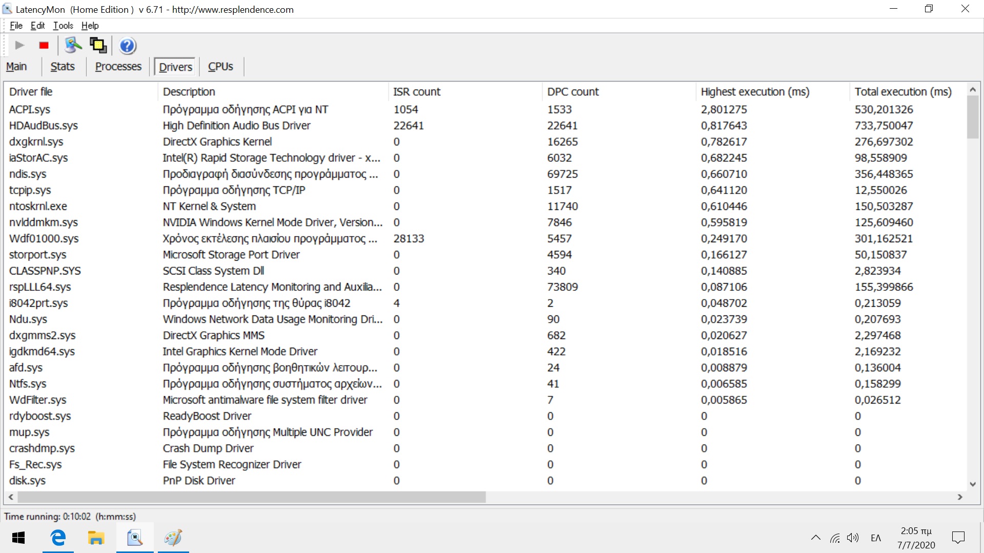 Ποόσταρε και ένα screenshot από την κάρτέλα Drivers του LatencyMon, με φθίνουσα κατάταξη κατά το πεδίο Highest execution