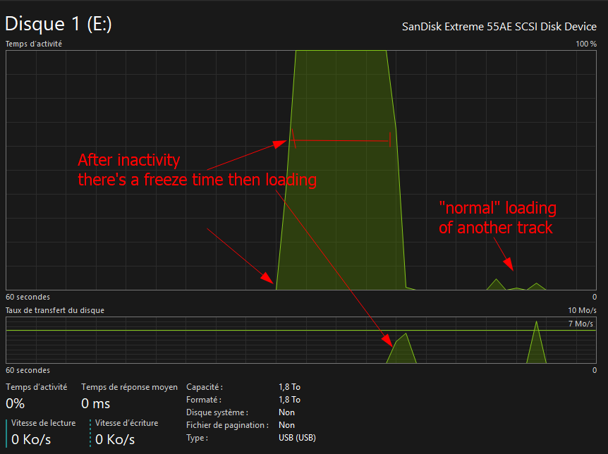 I changed the "energy" settings of my USB ports, as explained, but that is not sufficient. For whatever reason, the drive goes quickly to sleep, putting in danger the performance (because in some circumstances, VDJ crashes when the drive is too slow to answer– and this is not a VDJ issue: this freeze can crash much software so I guess it's Windows OS directly killing processes, I guess).
