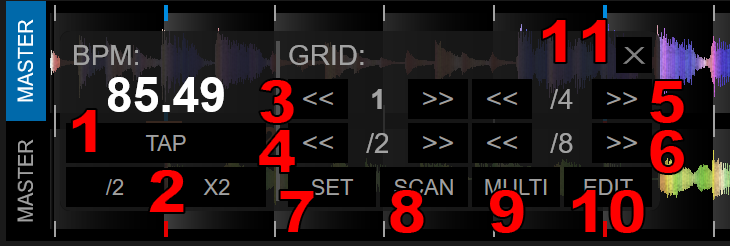 - Scan: Start an automatic BPM scan of the track (useful if you messed up and you want to reset the BPM analysis)