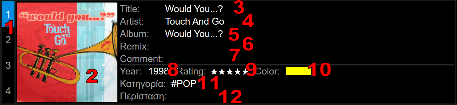 PS: If a track has a color set via the Tag Editor, but also has a color due to the current color rules, the screen will show the TAG color. Otherwise it will show either the TAG or the COLOR RULES color. - User1: Double click the text to edit the user 1 tag field.