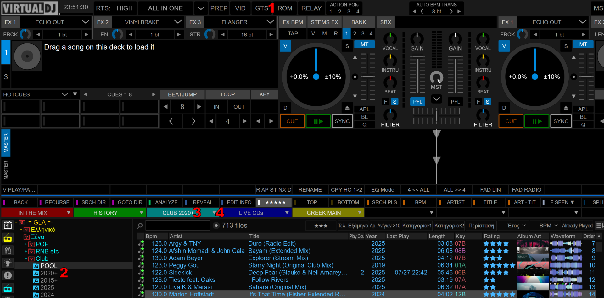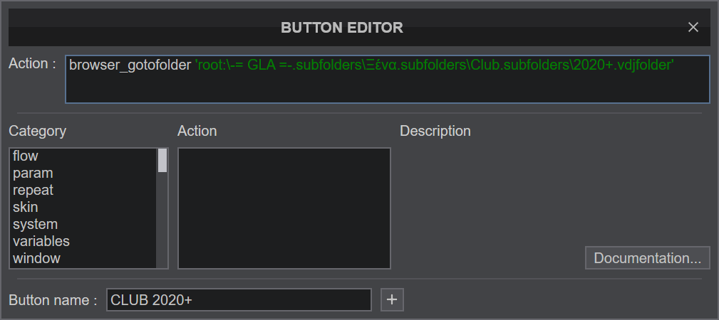 On our example we would type browser_gotofolder 'root:\-= GLA =-.subfolders\Ξένα.subfolders\Club.subfolders\2020+.vdjfolder'