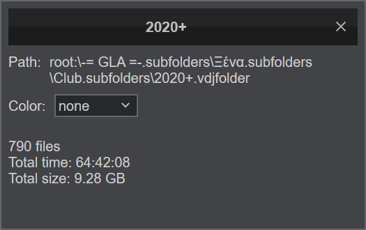 In this example it's root:\-= GLA =-.subfolders\Ξένα.subfolders\Club.subfolders\2020+.vdjfolder