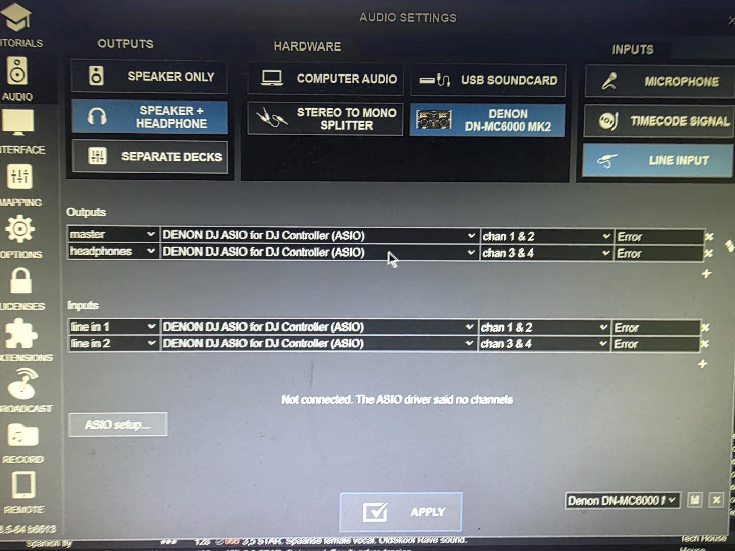 Checked the Audio Settings and this is where I see 4 times 'error' and the message 'Not connected. The ASIO driver said no channels'.