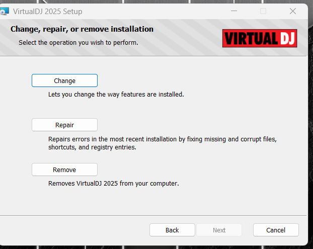 Which option do I select to reinstall virtual? Change, repair, or remove?
