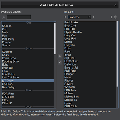 VirtualDJ FX engine has been completely revamped and modernized, and now offers more than 122 effects, including almost every FX from popular hardware mixers like Pioneer or Rane.
