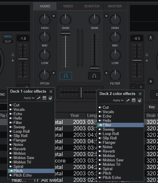 Now, in deck 2 color effects dropdown, only the 'filter' button works, but not the pitch or any other buttons. I'm genuinely stumped.