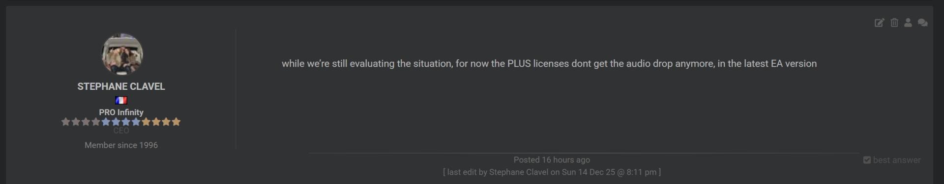 Off Topic, aber: Ich weiß, Kohle ist Kohle. Aber meine Meinung ist, die immer wieder in den letzten Jahren bestätigt wurde: die Infinite-Lizenz ist der Burner. Einmal zahlen und VDJ ballert dich mit Updates voll... Im Vergleich mit anderen Software-Herstellern, die für Add-Ons Kohle wollen. Was kostet die? 299? Ich habe noch nie bereut, diese gekauft zu haben; mich sogar immer wieder gefreut, wenn ich mitbekomme, wie andere Softwarehersteller mit ihren Kunden oder mit noch funktionierender Hardware umgehen.