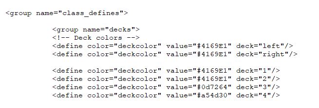 Well I opened it, and I think the route to go is all color defines with deck specified need entries including decks 2-4 deleted, and on entries with deck 1 specified then the deck specifier attribute needs removing, then maybe all decks will reference the deck 1 colour.