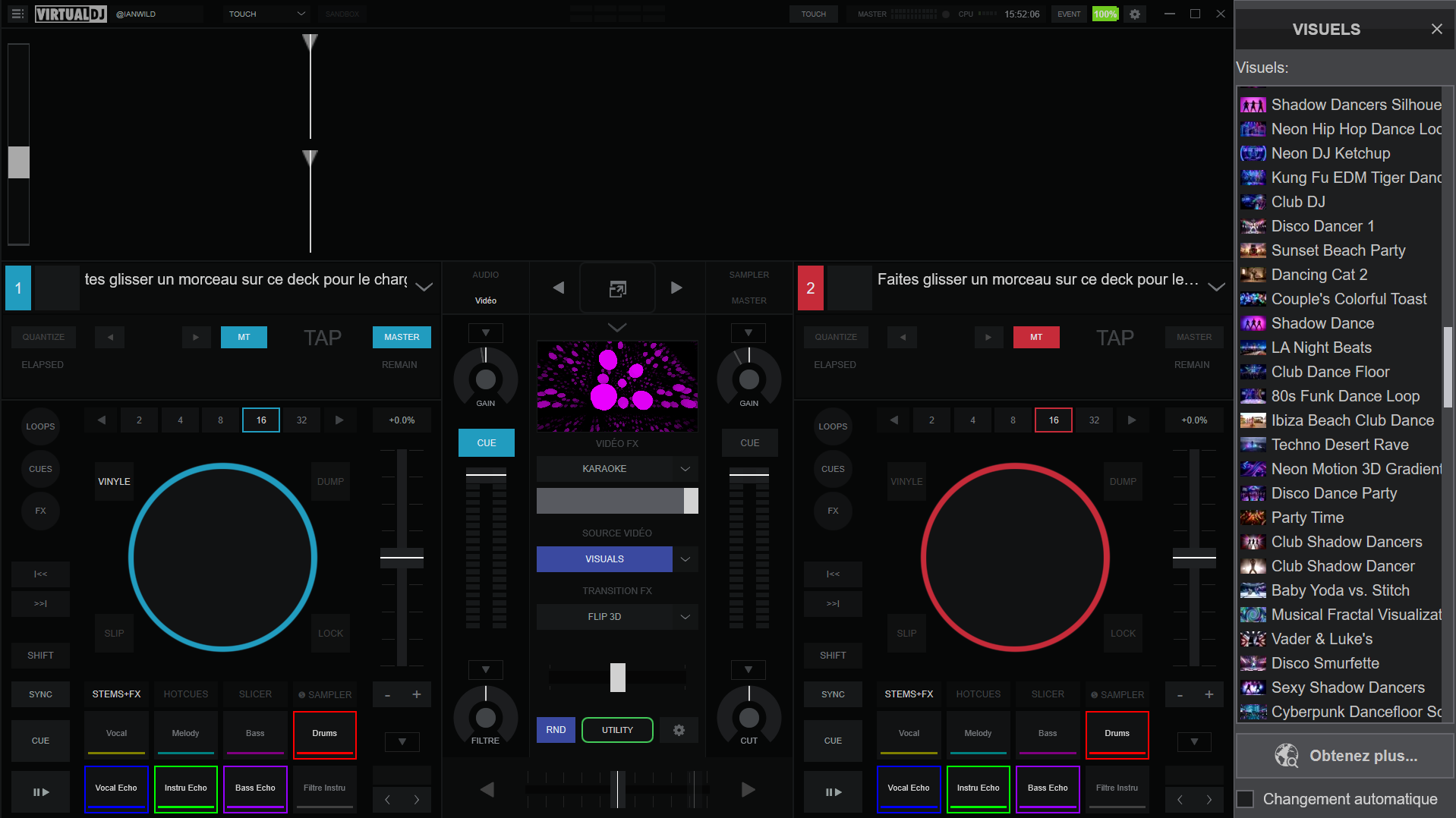 I tried to optimize my display space (1920x1080) to keep the VDJ interface and the visuals manager permanently displayed, knowing that I send the visuals full screen to external monitors in extended desktop mode.