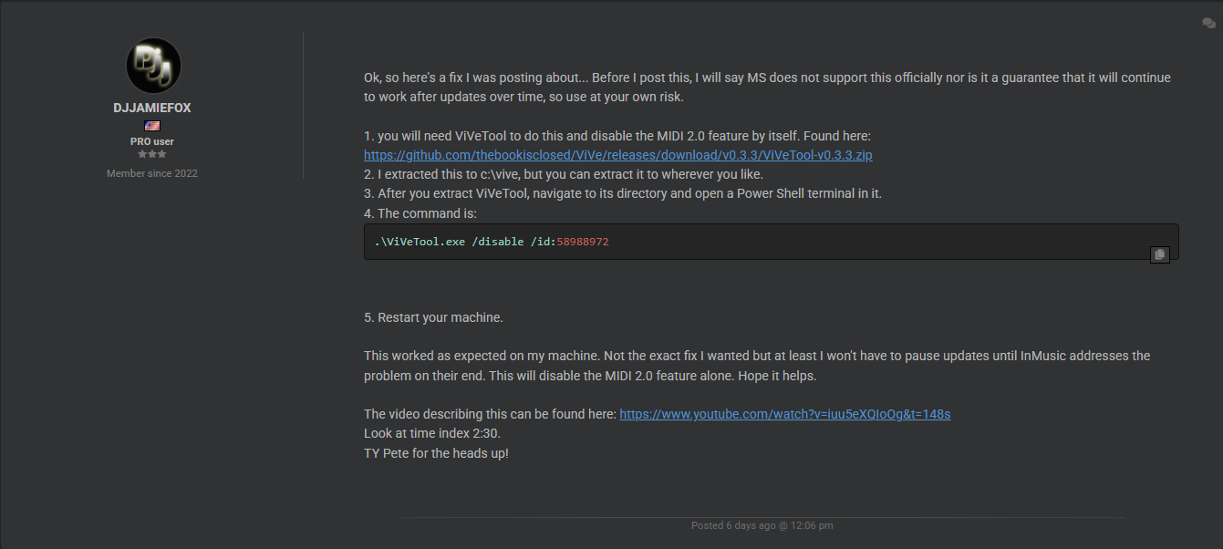 Necesitarás ViVeTool para hacer esto y desactivar la función MIDI 2.0 por sí sola. Se puede encontrar aquí: