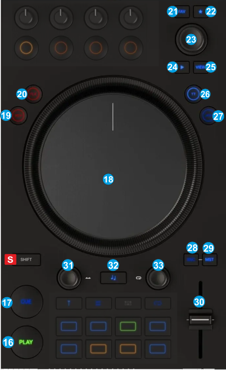 Hold SHIFT down and press this button to return to the beginning of the Track. - JOG: Touch-sensitive jogwheel to scratch, bend or adjust Beat grid.