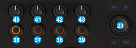 Hold SHIFT down and then use this button to open the FX List popup for FX Slot 1, then use the BROWSE encoder [23] to navigate through the list and make your selection. The led of this button will be lit in Cyan color, indicating the FX selection mode - FX2 BUT : Enable/disable the selected Effect of FX Slot 2.