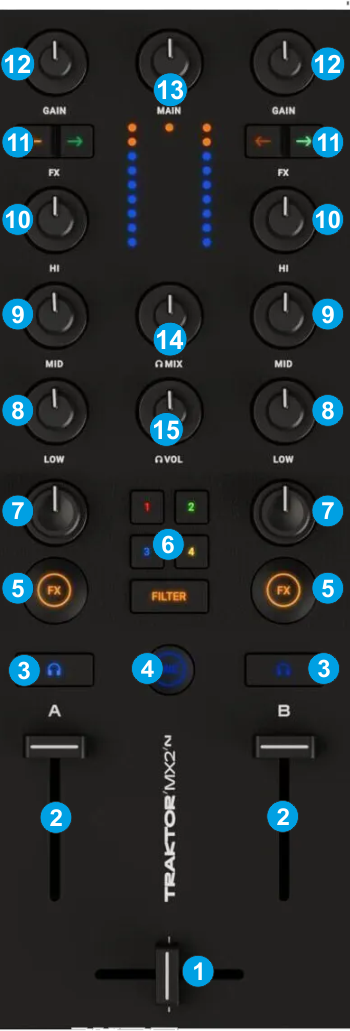 - CROSSFADER: Blends audio between the left and right channels/decks.