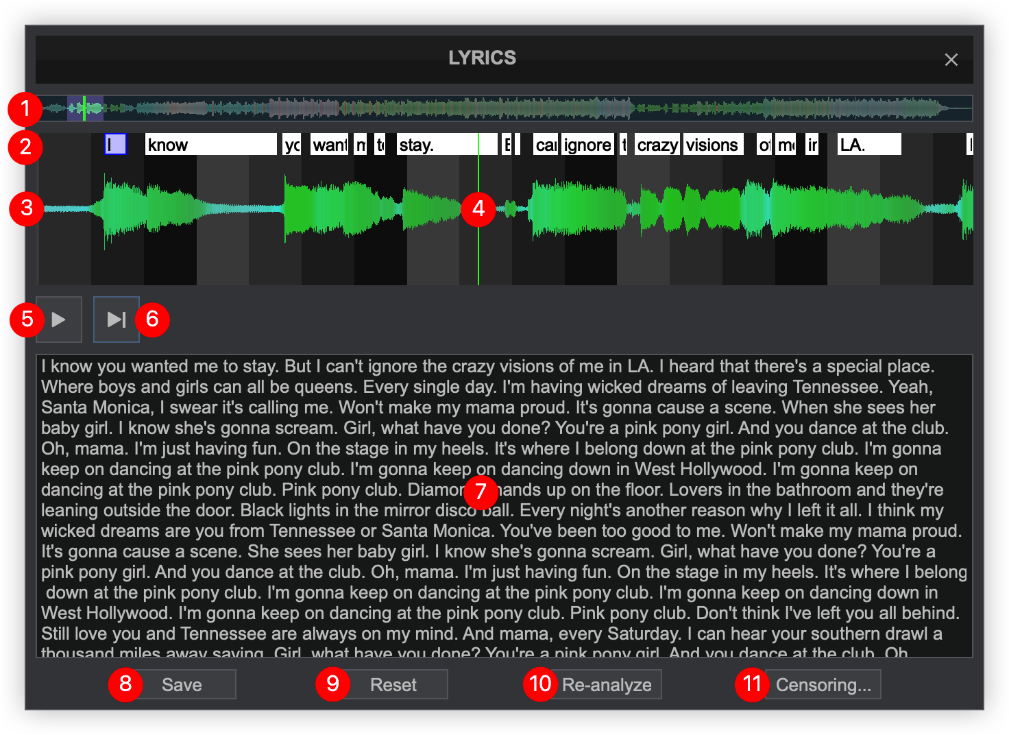 - WAVEFORM. Provides a visual display of the audio information and position of the lyrics as indicated by the playhead. It displays the beatgrid using the grayscaled background and can be zoomed in to make precise edits with a wheel mouse.
