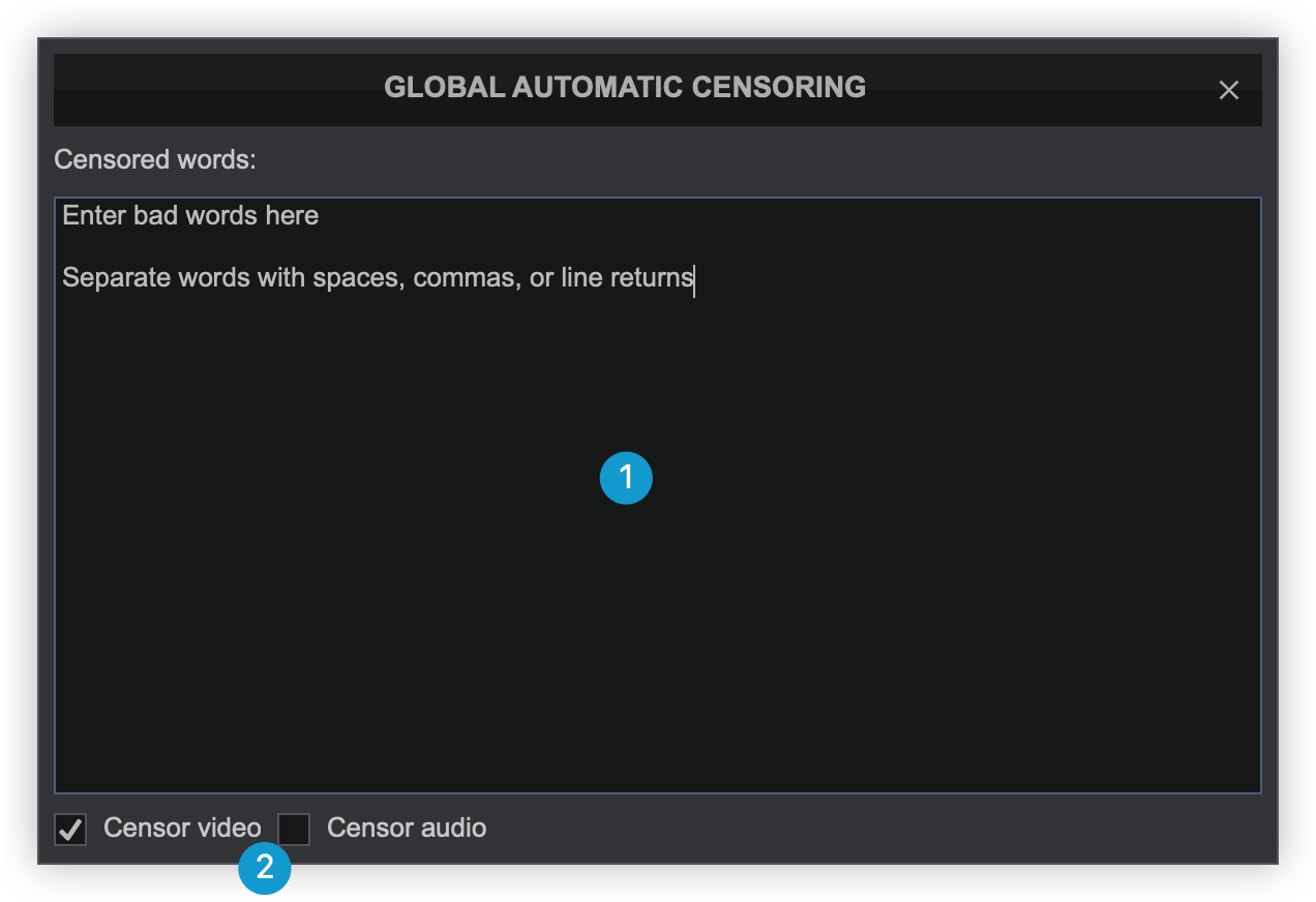 When Censor Video is enabled, the censored words will be replaced with asterisks on the video output. When Censor Audio is enabled, the audio will be muted for the defined word(s). Unchecking the box will disable censoring for the selected output.
