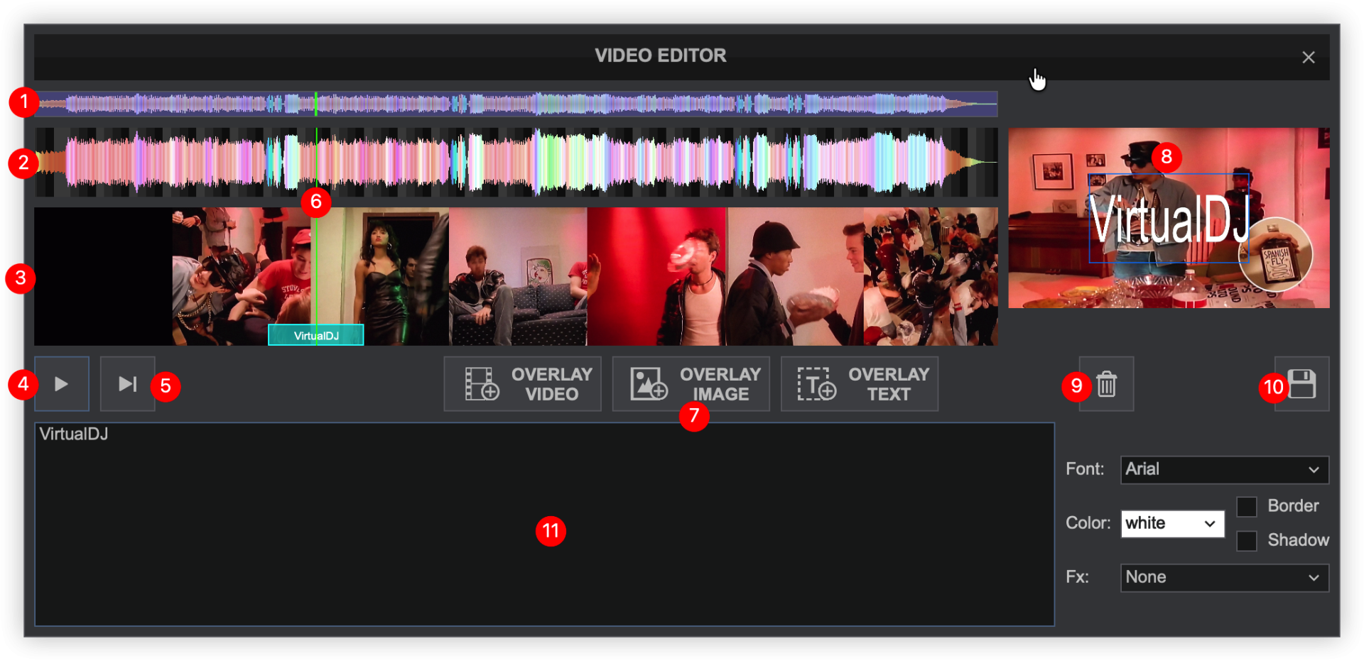 The Video Editor provides the ability to overlay video files and text over an existing Audio or Video track and is available as a Right-click option to any track in the File list. The process is non-destructive (does not alter the original file) and creates a special .vdjedit file that can be loaded to a deck and used in place of the un-edited original file.